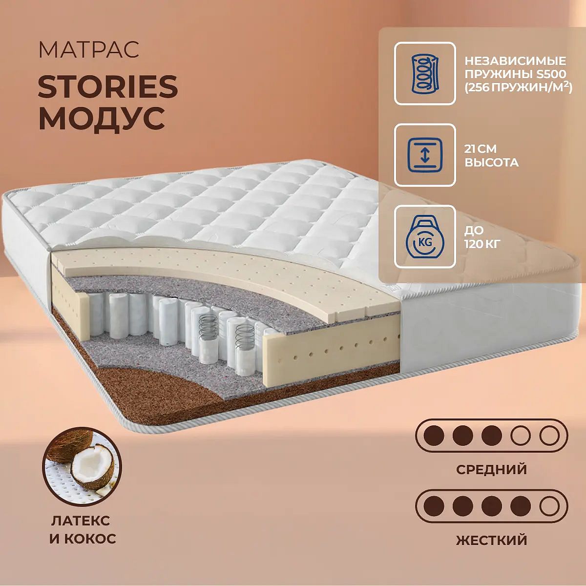 Матрас Stories Модус — это пружинный матрас с разной жесткостью сторон, который обеспечивает комфортный и поддерживающий сон. Одна сторона с латексом дарит умеренную мягкость и упругость, другая — с кокосовой койрой для более выраженной поддержки. Переворачивая матрас, вы выбираете оптимальное ощущение для своего сна. Высота матраса составляет 21 см, он рассчитан на нагрузку до 120 кг на спальное место. Независимый пружинный блок TFK (256 пружин/м2) равномерно распределяет вес и поддерживает позвоночник, снижая давление на тело. Ключевые особенности